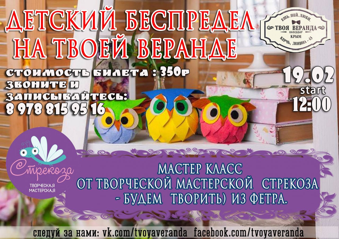 «Твоя Веранда» приглашает своих маленьких гостей, 19 января, в 12.00 посетить увлекательный мастер класс от творческой мастерской «Стрекоза» . Наши юные гости с энтузиазмом и интересом научатся делать подделки из фетра и смогут дать волю своей безграничной фантазии. Дружная атмосфера и море позитива - лучшее времяпровождение для ваших детей. Стоимость мастер класса 350 рублей. Записаться на мастер-класс можно по телефону: 8 978 815 95 16