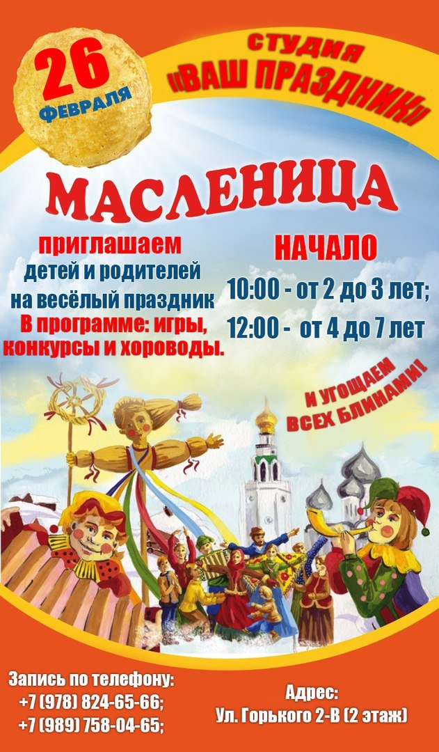 26 февраля, в воскресенье, весело проведи Масленицу вместе с командой студии «Ваш праздник» и получи сертификат на участие в «Смехо-party» 1 апреля!