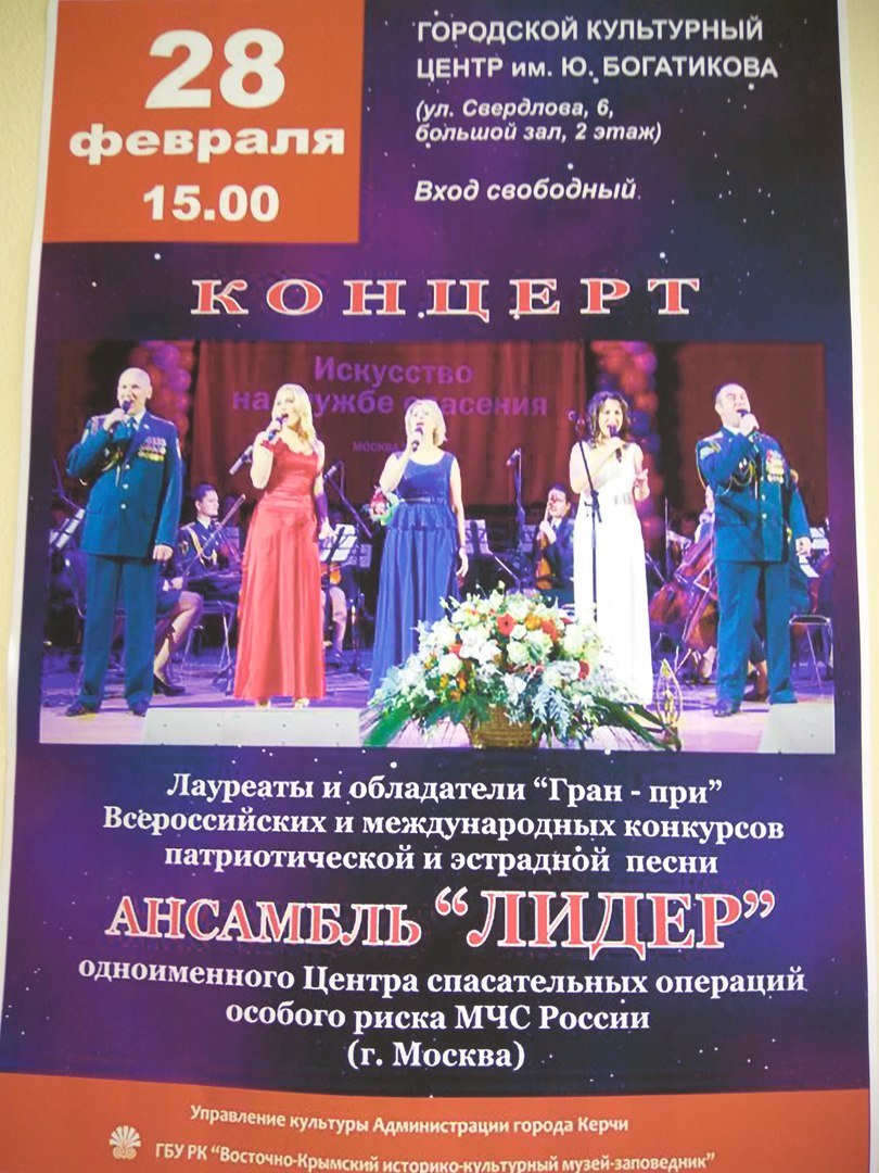 В Керчи, 28 февраля в большом зале Городского культурного центра им. Ю. Богатикова состоится концерт ансамбля «Лидер» одноименного Центра спасательных операций особого риска МЧС России (г. Москва).