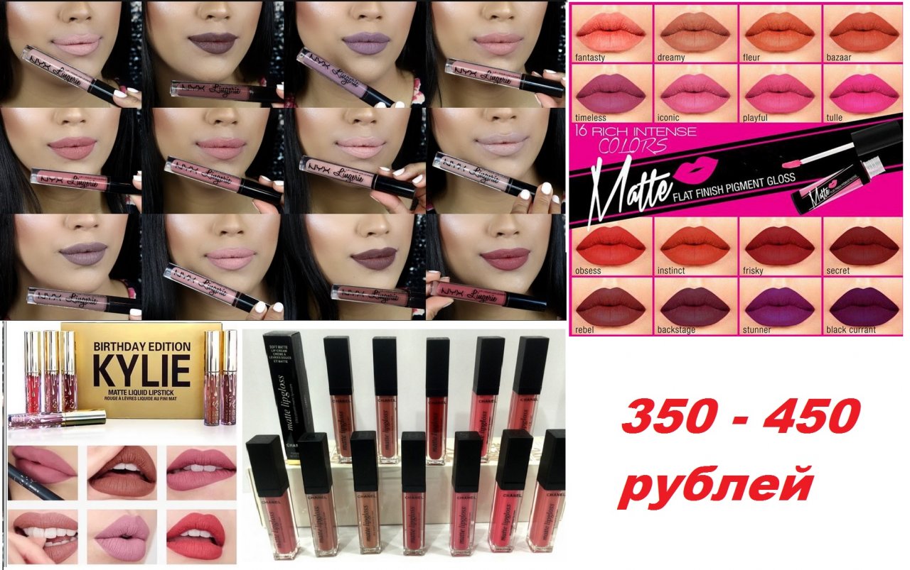 Блески и помады для губ NYX, MAC, Chanel, Kylie, Matte (350-450 рублей):