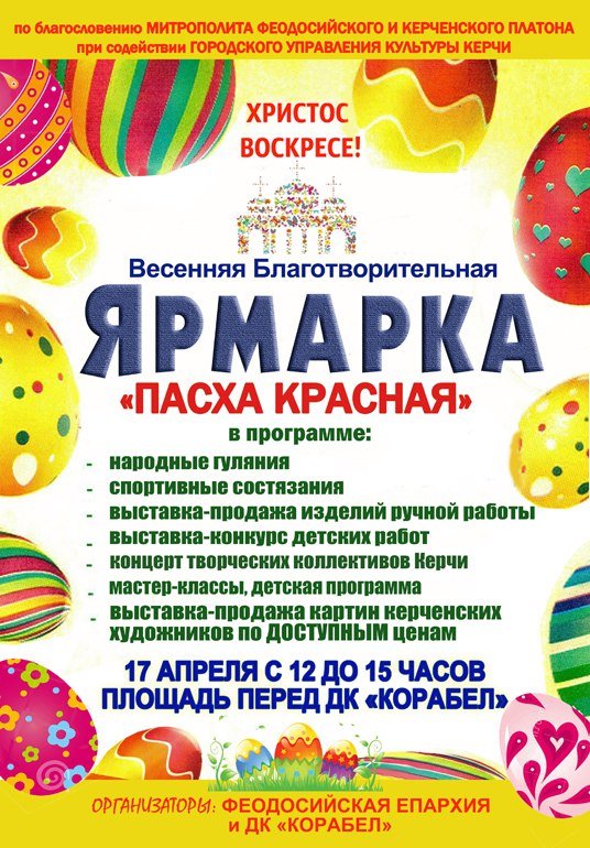 В Керчи, 17 апреля, с 12 до 15 часов, на площади перед ДК «Корабел» пройдет весенняя благотворительная ярмарка «Пасха красная». Об этом Керчь.ФМ сообщили организаторы ярмарки.