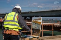 Перед пленэром художники пообщались с рабочими и осмотрели большую площадку строительства моста протяженностью 19 км.