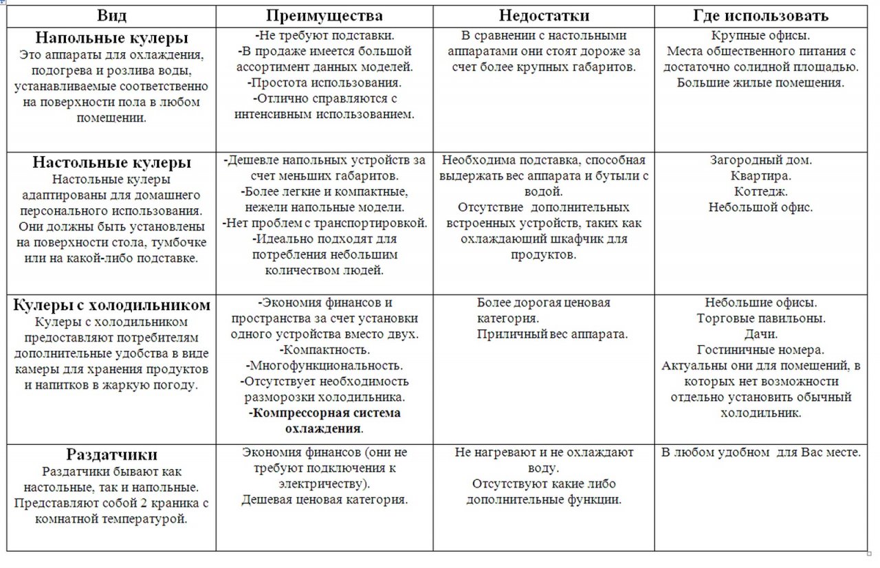 -Среди кулеров большой выбор моделей: настольные, напольные, со шкафчиками, с холодильником и конечно же абсолютно разнообразный дизайн, благодаря чему, каждая хозяйка может подобрать кулер под свой интерьер.