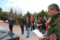 Волонтеры прочитали стихи и руководство города вместе с гостями из Ейска возложили цветы к Вечному огню.