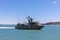 По легенде, в первый день тренировки катер, на котором находились условные террористы, должен был подойти к участку, где идет укрупнение и сборка судоходных арочных пролетов Крымского моста.