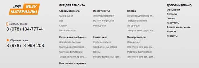 cтройматериалы · инструмент · керамическая плитка · тротуарная плитка · водо- и газоснабжение · сантехника · электротовары · напольные покрытия · входные двери · межкомнатные двери · бытовая техника