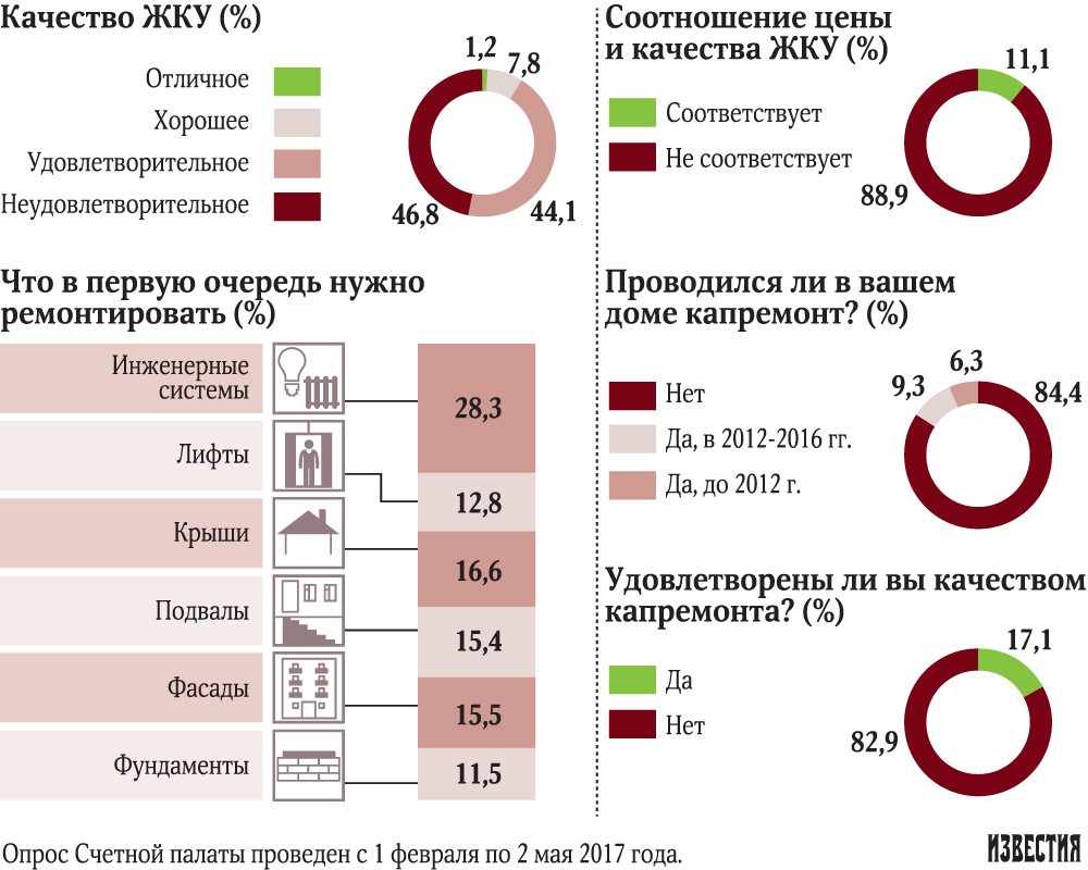 Почти 90% граждан считают, что качество жилищно-коммунальных услуг (ЖКУ) не соответствует их цене, 83% не удовлетворены капитальным ремонтом дома. Об этом сообщают «Известия» со ссылкой на онлайн-опрос Счетной палаты РФ (СП), - передает Керчь.ФМ.