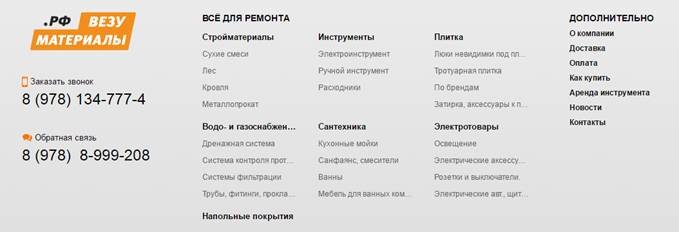 cтройматериалы · инструмент · керамическая плитка · тротуарная плитка · водо- и газоснабжение · сантехника · электротовары · напольные покрытия · входные двери · межкомнатные двери · бытовая техника