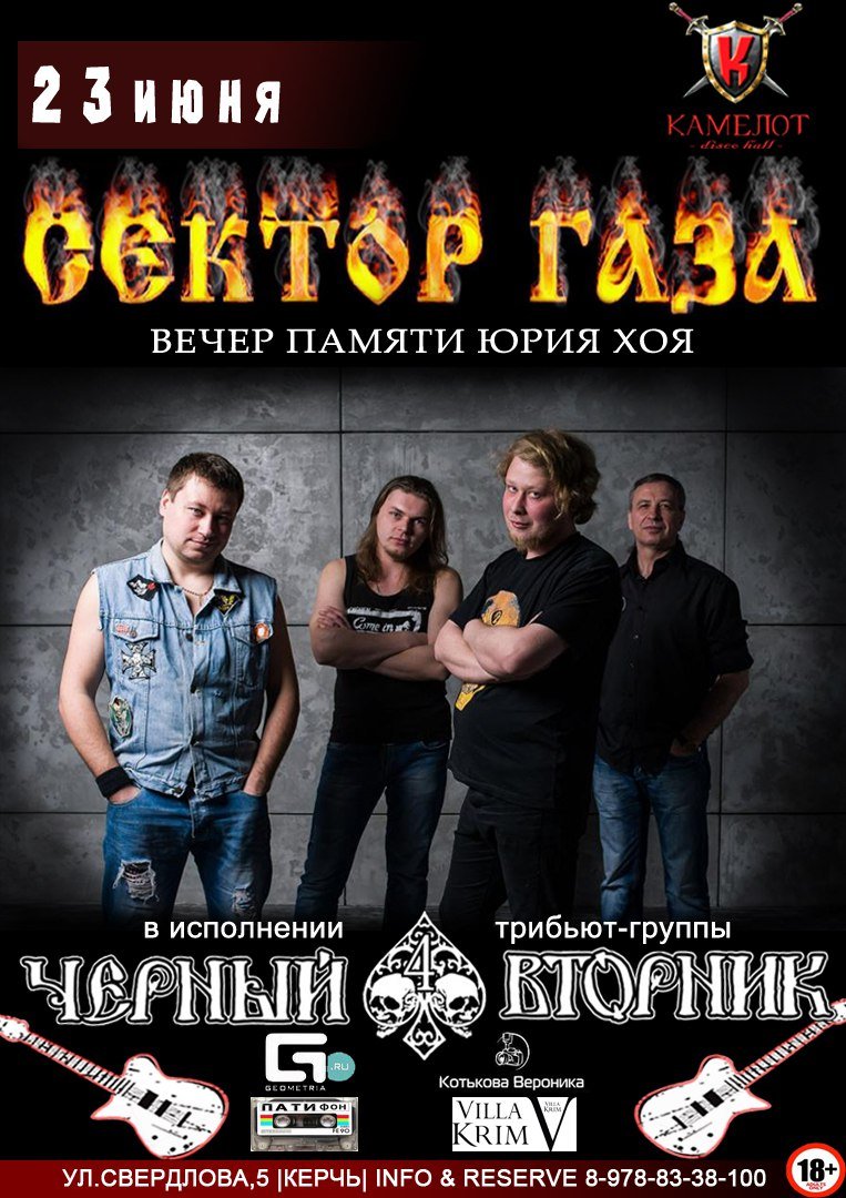 Популярные и всеми любимые песни группы «Сектор Газа» исполнит трибьют-группа «Черный Вторник» из города Иваново. Важно отметить, что группа «Черный Вторник» является трибьют — проектом легендарной группы «Сектор Газа». Единственная группа, которую поддерживают как бывшие участники гр. «Сектор Газа», так и родственники Юрия Клинских.