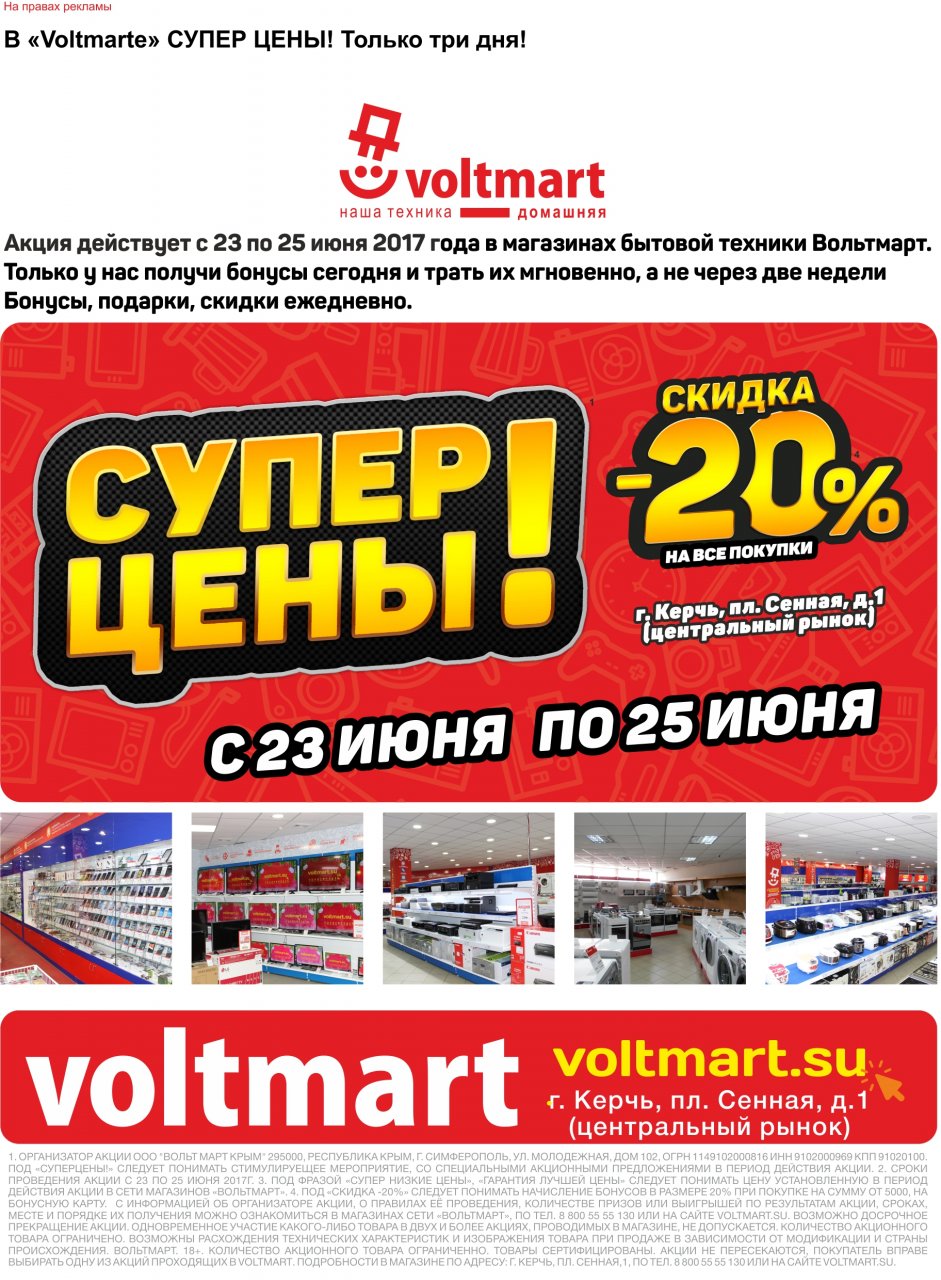 Только три дня - с 23 по 25 июня 2017 года в магазине бытовой техники «Вольтмарт»! Только у нас получи бонусы за покупку сегодня и трать их мгновенно, а не через две недели! Бонусы, подарки, скидки ежедневно!