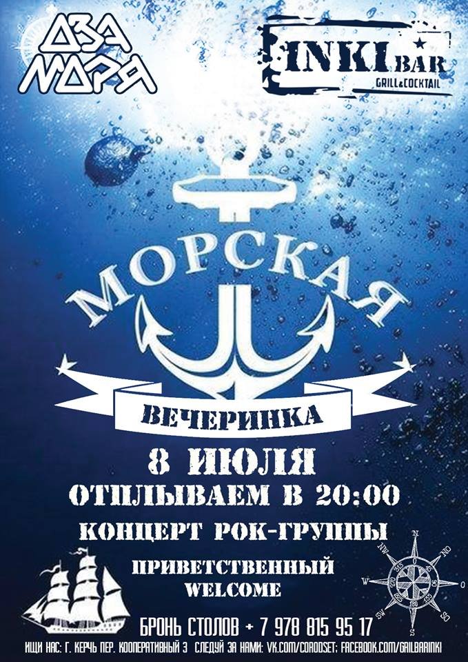 08 июля, в День Рыбака, Гриль-бар ИНКИ приглашает на концерт рок-группы «Два моря». Неутомимые труженики гитарного рока и неординарных ритмов не оставят равнодушными любителей настоящего русского рока. Угощаем традиционными комплиментами. Желаешь провести незабываемый вечер в ритме и драйве?