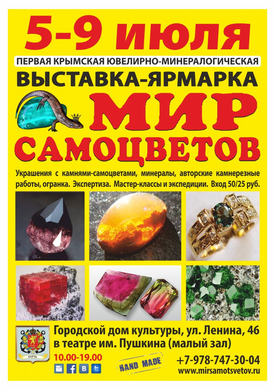 Традиционно на вторые выходные жаркого июля ко Дню Рыбака первая крымская ювелирно-минералогическая выставка-ярмарка Мир Самоцветов порадует дорогих керчан и гостей города-героя, а также настоящих ценителей красоты и гурманов совершенства, настоящими природными камнями-самоцветами, минералами, кристаллами, работами лучших мастеров Крыма и Урала в серебре и коже, палео находками и космическими метеоритами, сможем определить ваш камень и проведем мастер-класс с вашими детками.