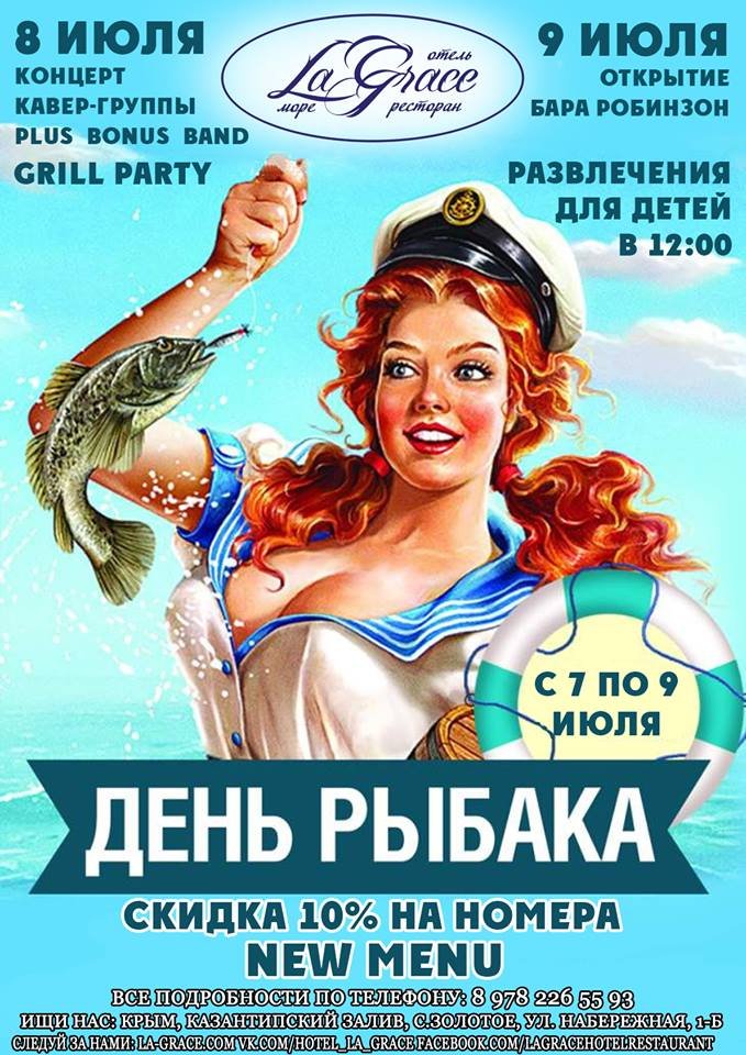 Друзья, хватит киснуть в городе)) Отпразднуйте главный праздник лета - День Рыбака в отеле  LaGrace. Для Вас с 7 по 9 июля на номера будет действовать скидка 10%. 8 июля  концерт всеми любимой драйвовой кавер-группы PLUS BONUS BAND. А 9 июля вы сможете насладится коктейлями прямо на пляже, ведь мы открываем летний бар Робинзон. Для нашим маленьких гостей  в 12-00 развлекательная программа с аниматором. Проведи этот уикенд вместе с LaGrace.