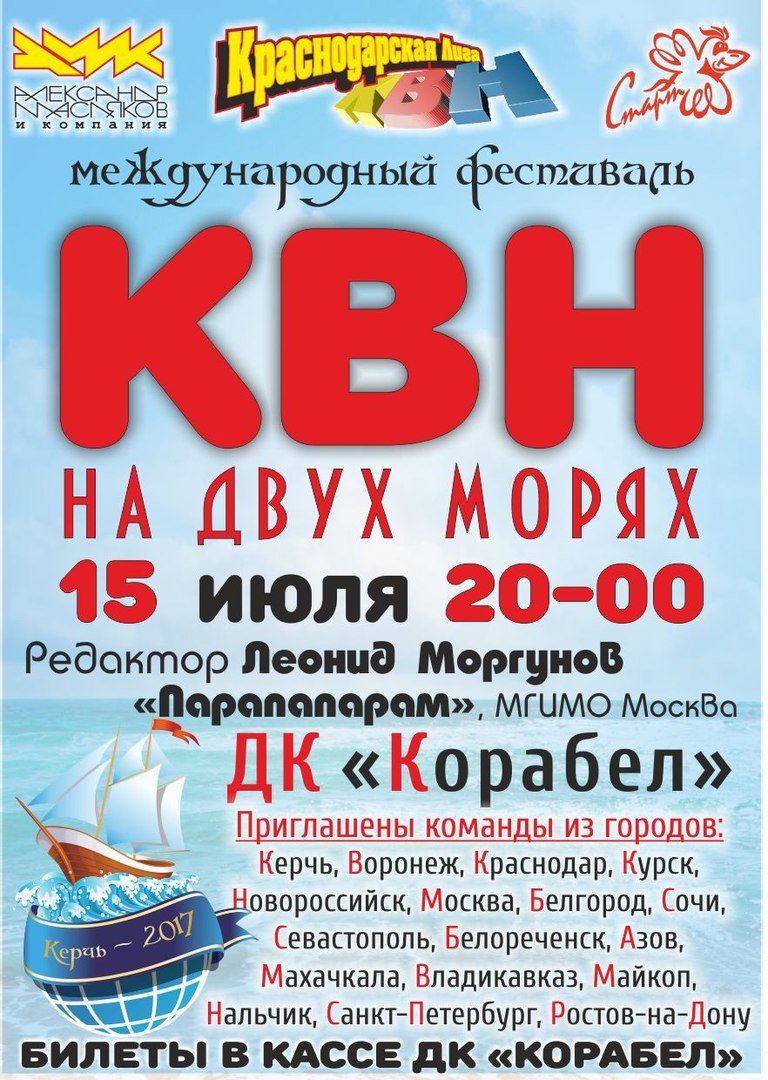 Уже второй год подряд Центральная Краснодарская Лига Международного союза КВН и Центральная лига «Старт КВН» г.Воронеж по поручению Телевизионного творческого объединения «АМиК» проводит 15 июля 2017 года в городе-герое Керчь Международный Фестиваль команд КВН "КВН на двух морях".