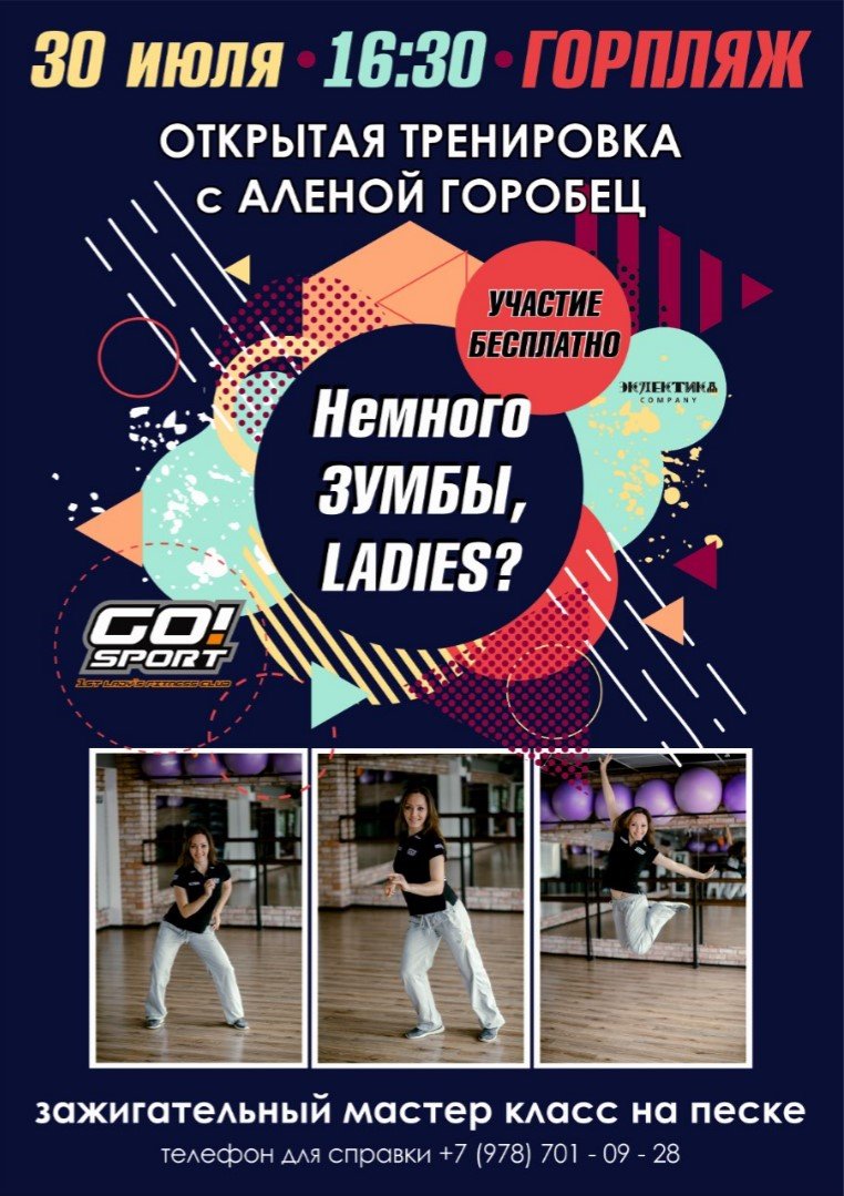 30-го июля, в 16:30 на городском пляже для всех желающих превратить обычную поездку на пляж в незабываемый и яркий отдых в ритме ЗУМБЫ мы организовываем открытую танцевальную тренировку. Разучиваем основы самого зажигательного фитнес направления - ZUMBA.