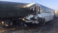 По предварительным данным, легковой автомобиль «ВАЗ 21111» выехал на полосу встречного движения, допустил лобовое столкновение с частным автобусом, осуществляющим разовую коммерческую перевозку «Порт Кавказ» - Анапа. Автобус, уходя от столкновения, допустил наезд на стоящий на обочине КАМАЗ. От сильного удара КАМАЗ отбросило на стоявший на обочине впереди него другой КАМАЗ.