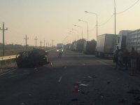 Напомним, водитель «ВАЗ-21111» выехал на полосу встречного движения и столкнулся с рейсовым автобусом Mercedes, который столкнулся с припаркованными на обочине грузовиками.