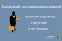 Как сообщалось, согласно распоряжению Генерального прокурора Российской Федерации дни приема предпринимателей являются всероссийскими и проводятся регулярно в первый вторник каждого месяца в рабочее время уполномоченными работниками прокуратуры.