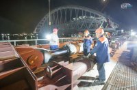 Когда железнодорожная арка будет передвинута до конца пирсов, ее переместят на вспомогательные опоры для последующих операций по подготовке к погрузке на плавучую систему.