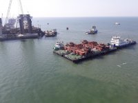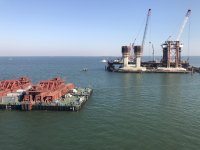 Первая плавучая опора проходит испытания в фарватерном створе, в месте выгрузки и подъема пролетных строений. Вторая опора тестируется в «ковше» у керченской технологической площадки там, где пролеты будут грузиться.