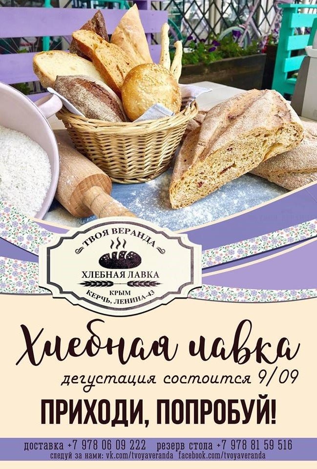Хлеб - один из самых удивительных продуктов человеческого труда. Твоя Веранда представляет первый ремесленный хлеб по особому рецепту и приглашает 9 сентября на дегустацию Хлебной лавки. Пшеничный и солодовый, с моцареллой, вялеными томатами, с карри и изюмом. Приходи, пробуй и выбирай свой хлеб.