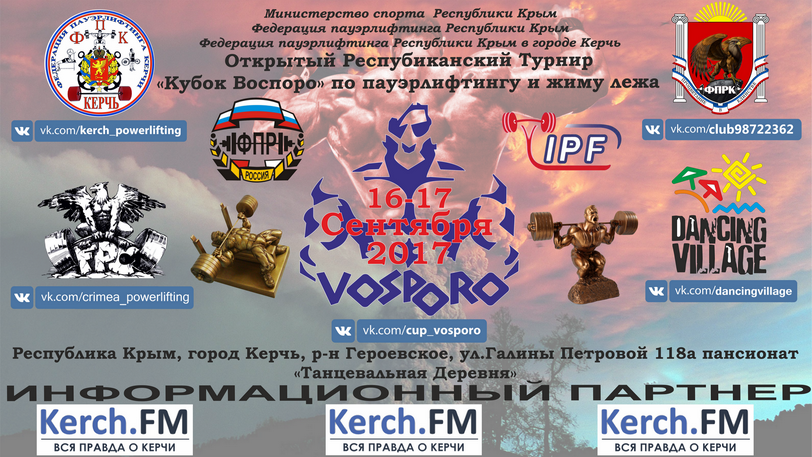 В Керчи, в поселке Героевское, 16 и 17 сентября на базе отдыха Танцевальная Деревня, пройдет Открытый Республиканский Турнир по пауэрлифтингу «ВОСПОРО» жиму штанги лежа, пауэрлифтингу, - передает Керчь.ФМ.