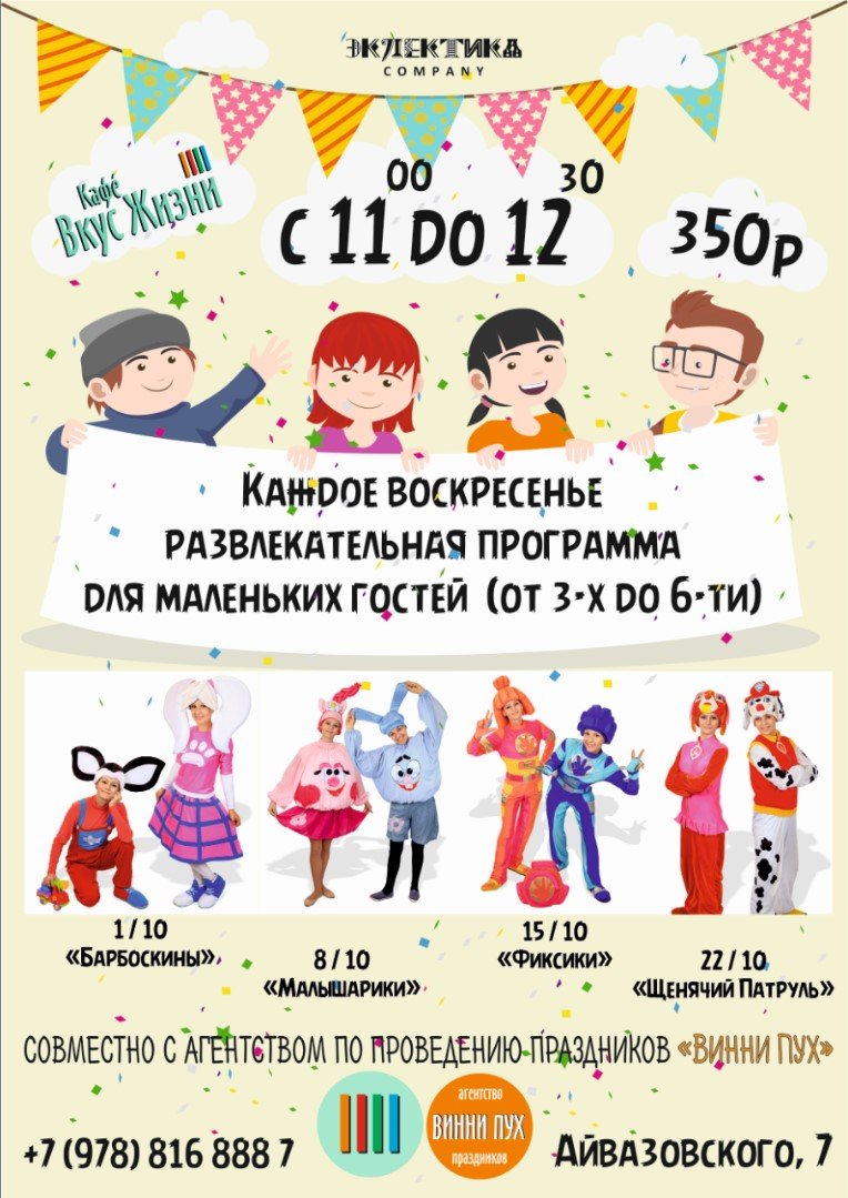 КАЖДОЕ ВОСКРЕСЕНЬЕ наших маленьких гостей будут ждать герои самых любимых мультфильмов.
