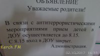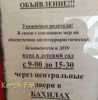 «Привел ребенка в детсад и увидел надпись, в связи антитеррористическими мероприятиями прием в ДОУ до 8:15, после 8:15 дети приниматься не будут .. Мне вот одно интересно, кто занимается подобным маразмом и для чего и кому это надо??? Что же происходит после 8:15? Может охрану убирают? Да нет, все тоже самое!! Полез в интернет, чтоб глянуть, что в других детсадах творится, а там маразмы, да еще круче керченских. Камеры поставили, молодцы, но тогда и надо охранника, который будет следить за этими камерами, за проникновением посторонних на территорию детсада, Общее впечатление, что люди Гоголя в школе не читали, а так же, сказку про голого Короля. Безопасность, конечно же нужна, но не такими же мерами!», - возмутился керчанин.
