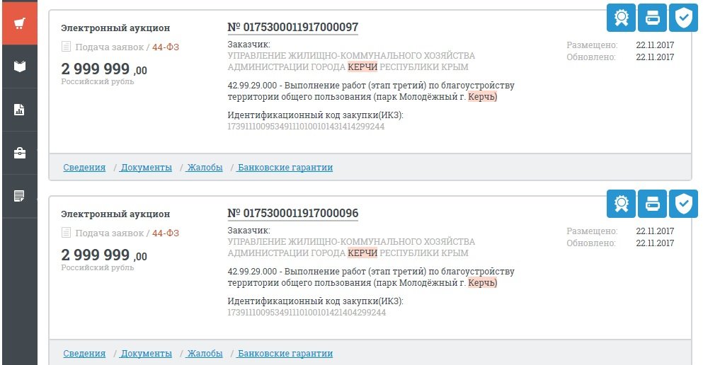 Управление жилищно-коммунального хозяйства Керчи объявило сразу два аукциона на заключение контракта на выполнение работ (этап третий) по благоустройству территории общего пользования (парк Молодёжный) на сумму 2 999 999 рублей каждый. Ранее мы писали, что на реконструкцию парка в Аршинцево потратят свыше 13 млн рублей. Информация и документация выложена на портале Госзакупок, - передает Керчь.ФМ.