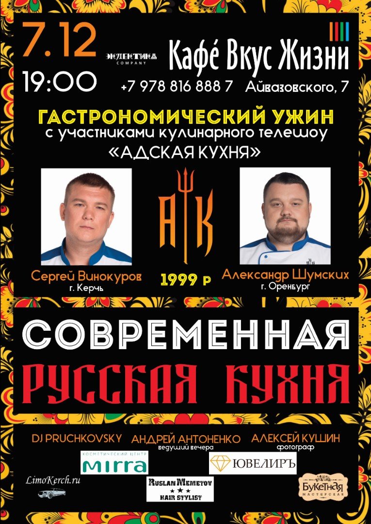 В город-герой Керчь приглашен участник синей команды, Александр Шумских (г. Оренбург). Совместно с бренд-шефом кафе "Вкус Жизни" и кафе Bon Appetit, Сергеем Винокуровым, коллеги по съемочной площадке проведут для керчан и гостей города ГАСТРОНОМИЧЕСКИЙ УЖИН на тему: СОВРЕМЕННАЯ РУССКАЯ КУХНЯ.