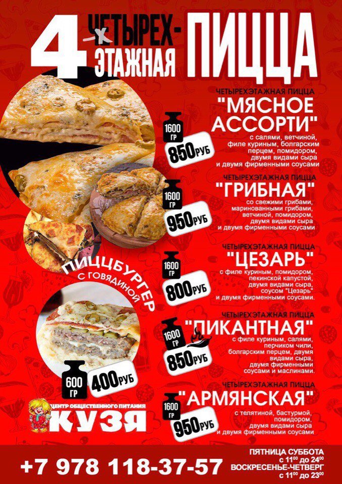 Впервые в Керчи! Предлагаем Вам самую вкусную 4-этажную пиццу от Центра Общественного Питания «КУЗЯ». Такого Вы ещё не пробовали! Пиццбургер с говядиной принесёт Вам гастрономическое удовольствие!