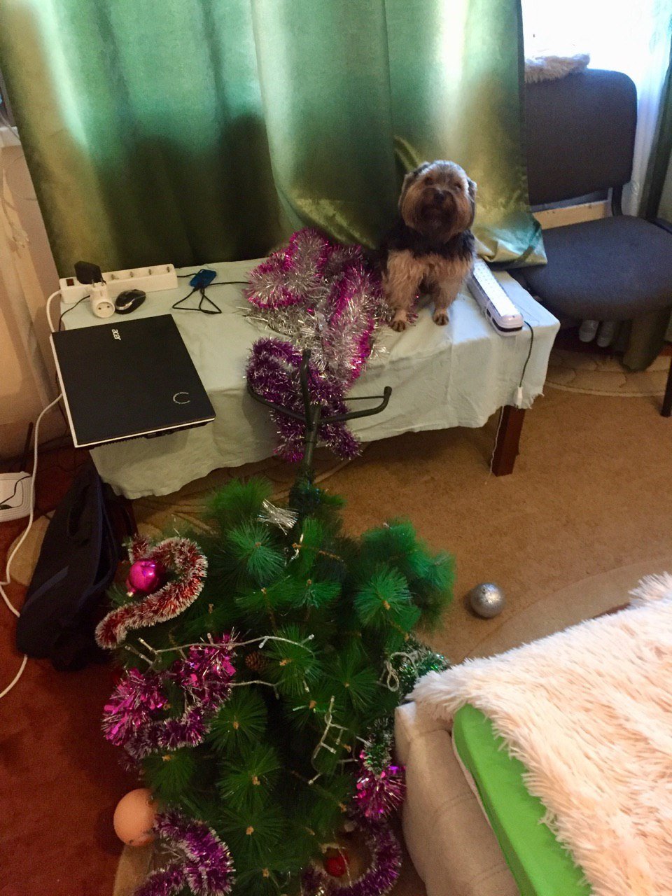 А Мила прислала фотографию своего друга Жоры, который уже успел уронить новогоднюю елку.