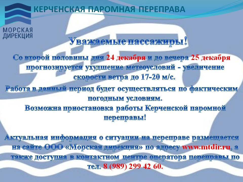 Работа в данный период будет осуществляться по фактическим погодным условиям. Возможна приостановка работы Керченской паромной переправы.