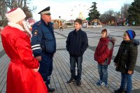 Сотрудник отдела ГИБДД УМВД России по г.Керчи Алексей Крихели интересовался у ребят знаниями правил безопасного поведения на дороге. За правильные ответы полицейский вручал девчонкам и мальчишкам световозвращаюшие элементы, которые ребята должны использовать в темное время суток, а Полицейский Дед Мороз раздавал сладости и мандарины.