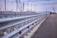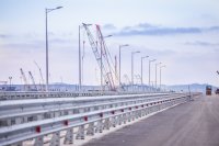 На одном из участков автодорожной части Крымского моста выполнено обустройство проезжей части. Это передовой участок строительства на острове Тузла, где дорожники установили барьерное ограждение и мачты освещения на протяжении 450 метров будущей автодороги.
