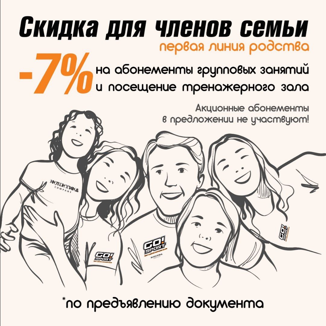 Новинка: семейная скидка в размере 7% на абонементы групповых направлений и посещение тренажерного зала.