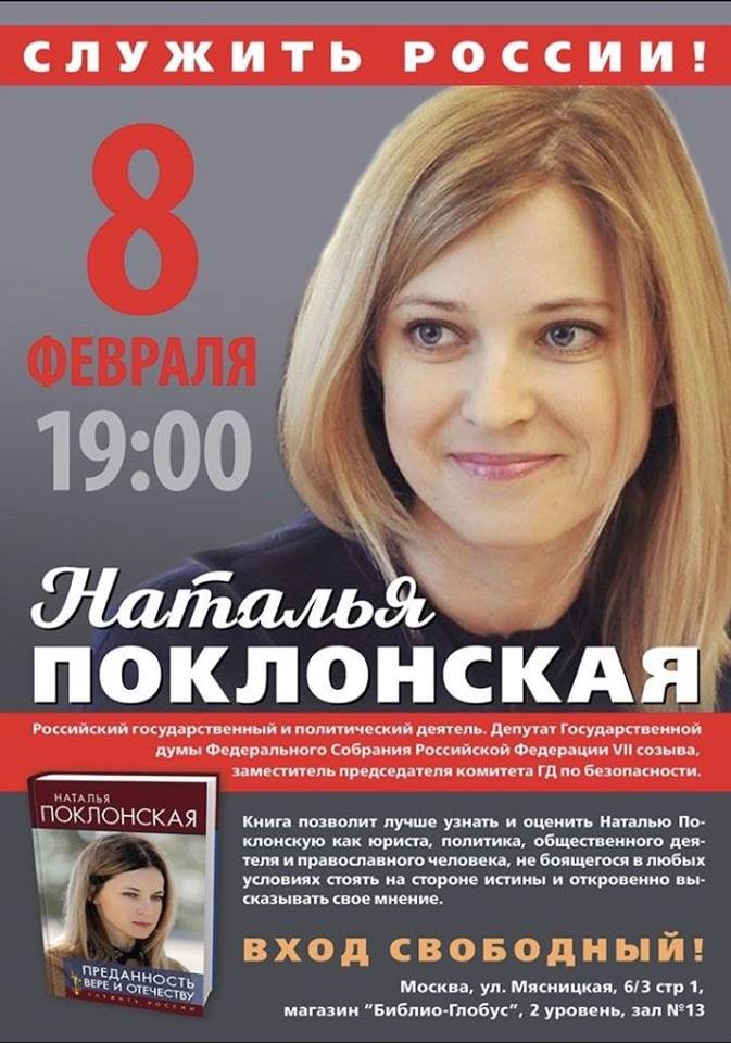 Сегодня, 8 февраля, в Москве депутат Госдумы Наталья Поклонская презентует книгу о себе «как о юристе, политике, общественном деятеле и православном человеке, не боящемся в любых условиях стоять на стороне истины». Об этом сообщила она в соцсети, - передает Керчь.ФМ