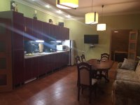 Площадь 80 кв.м., 2 отдельные спальни, гостиная-столовая 30 кв.м., интернет, отдельный вход со двора. Есть вся необходимая техника, кондиционер. Очень теплая квартира! Имеется своя стоянка и дворик для отдыха.