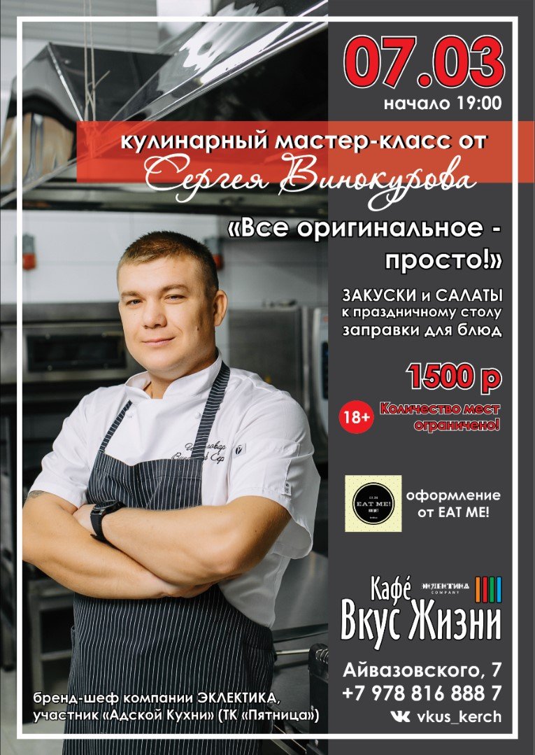 В канун самого женственного праздника года команда кафе "Вкус Жизни" организовывает кулинарный мастер-класс от бренд-шефа компании ЭКЛЕКТИКА, Сергея Винокурова (участник "Адской Кухни", ТК "Пятница").