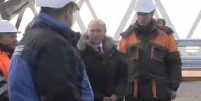 На арке его встретили министр транспорта Максим Соколов, глава Крыма Сергей Аксёнов, руководитель Росавтодора Роман Старовойт, руководство Краснодарского края. Несмотря на визит высокопоставленного гостя, рабочие не прекращают строительство моста.