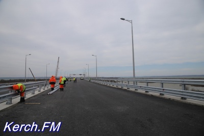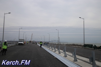 Автодорожная часть Крымского моста уже построена - забиты все сваи, готовы пролеты. Остались работы по устройству дорожного полотна, большая часть уже заасфальтирована в два слоя. На участках с асфальтом устанавливают барьерное ограждение, мачтовое освещение и информационные табло, оборудуют ливневки.