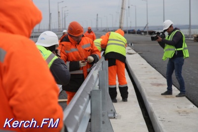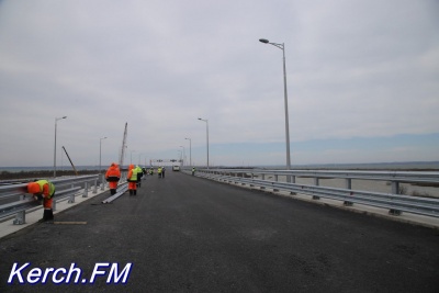 Он отметил, что автодорога на мосту заасфальтирована на 70%. Всего заасфальтировано 14 из 19 км. Параллельно укладке асфальта ведётся обустройство барьерного ограждения, которое уже выполнено на 60%. Смонтировано 70% элементов искусственного освещения.