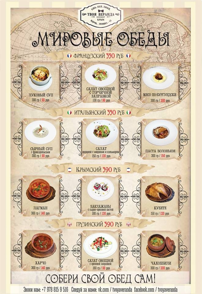 А вы знали, что 1+1=1? Берешь два обеда, а платишь за один! «Твоя Веранда» приглашает всех ценителей вкусных обедов, с 11.00 до 16.00 с понедельника по пятницу, вкусно отобедать).