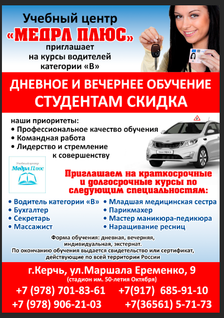 Учебный центр «Медрл плюс» приглашает на курсы водителей категории «В»