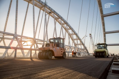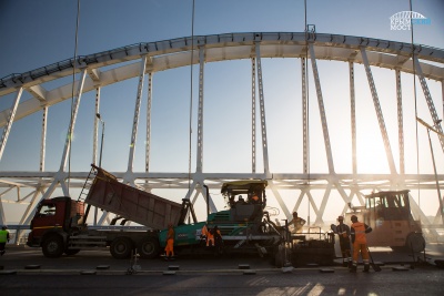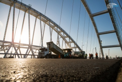 Строители приступили к укладке асфальтобетона на автодорожной арке Крымского моста. Работа выполняется в два этапа: нижний слой уже выполнен, верхний будет уложен после технологического перерыва, через несколько дней.