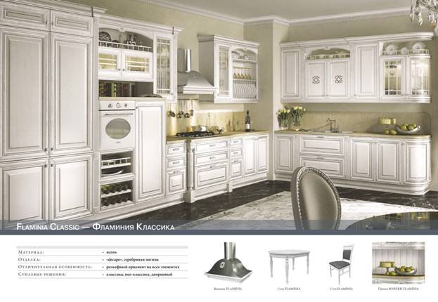 Модель Flaminia (Фламиния) - создана в стиле современной классики. Фасады и декоративные элементы, выполненные из массива ясеня, имеют богатую отделку в технике «decape», дополненную серебряным патинированием. Серебряная патина подчеркивает белизну элементов, строгую геометрию линий и благородство форм. Внутренняя часть рамки фасада украшена накаткой в форме округлово узорчатого орнамента. Такой же орнамент украшает карнизы и цоколь. Столешница из искусственного акрилового камня/пластик. Корпус ЛДСП/столярная плита/ фанера/ МДФ, отделка шпон ценных пород дерева/пластик/эмаль/шпон. Механизмы трансформации Blum/Hettich/Hafele. Для модели разработаны декоративные стекла, вытяжка и столовая группа.