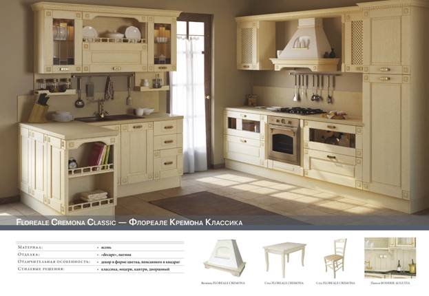 Модель Floreale (Флореале) - Фасады и декоративные элементы модели выполнены из массива ясеня в четырех цветовых решениях: Stone, Teak, Cremona, Verde. Подчеркивающей красоту естественного рисунка древесины, делая его более контрастным. Столешница из искусственного акрилового камня/пластик. Корпус ЛДСП/столярная плита/ фанера/ МДФ, отделка шпон ценных пород дерева/пластик/эмаль/шпон. Механизмы трансформации Blum/Hettich/Hafele. Для модели разработаны декоративные стекла, вытяжка и столовая группа.