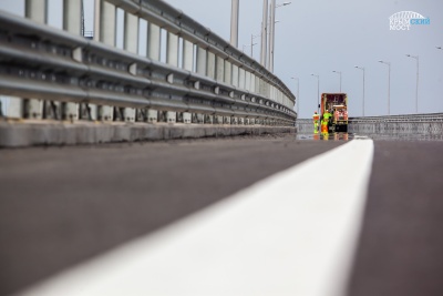 На автодорожной части моста через Керченский пролив началось нанесение дорожной разметки. Это один из финальных этапов работ по обустройству дорожного полотна, который стартовал со стороны таманского берега. Об этом сообщает инфоцентр «Крымский мост», - передает Керчь.ФМ