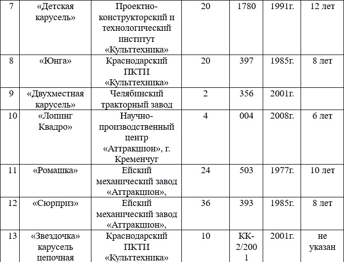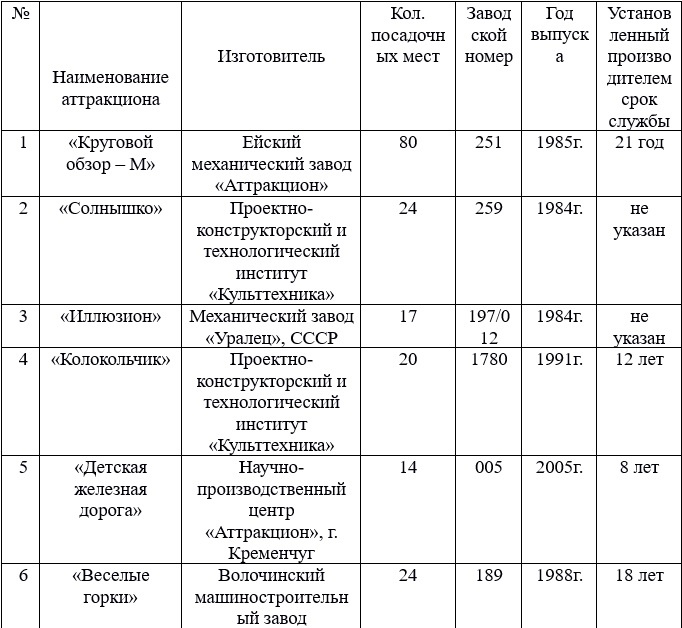 Необходимо оценить техническое состояние 13 аттракционов, а именно: