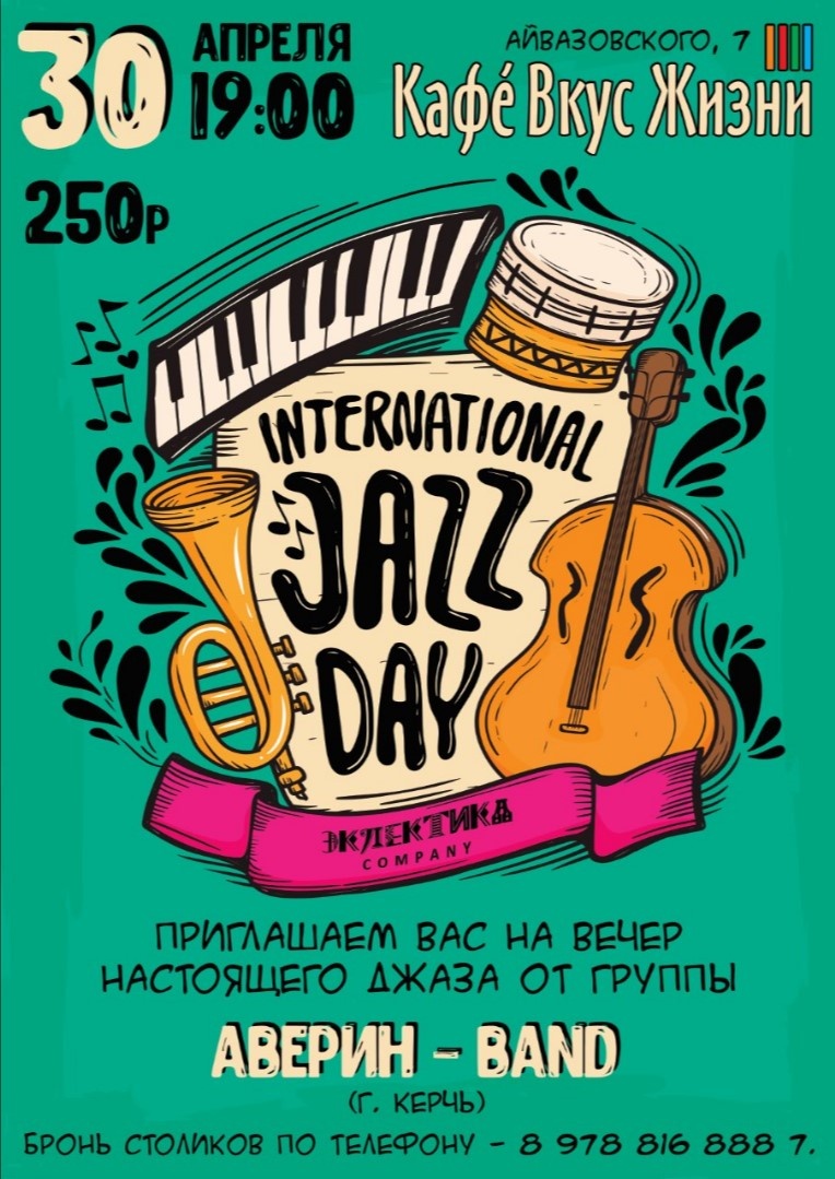 30 апреля - Международный день джаза! С 2012 этот праздник символизирует мир, единство, диалог и понимание между людьми. Команда кафе «Вкус Жизни» решила поддержать данное событие и порадовать всех поклонников джаза музыкальным вечером. Приглашаем Вас и Ваших близких насладиться уникальной музыкой времен сухого закона, Эллы Фицджеральд и других ярких представителей того времени 30-го апреля. Приглашенная группа АВЕРИН-band (представители городского оркестра) представит Вам настоящий джаз в исполнении 7-ми музыкантов. Начинаем в 19:00. Стоимость входа - 250р. Просим Вас заблаговременно забронировать столик - 8 978 816 888 7.